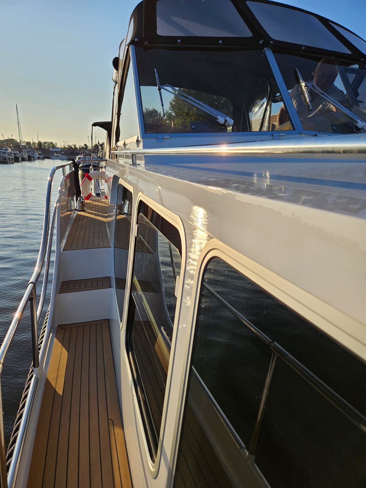 "[..] at a leisurely speed of 2.5 knots, we are sailing towards Lake Sneekermeer. The Gruno sits like a plank in the water and moves forward at a perfect cruising speed," says Peter Marienfield, editor at Skipper. He describes the ship as cozy and emphasizes the space on board. "The double bed measures 200 x 180 centimeters, there is ample storage space for luggage, and numerous extra storage options."
