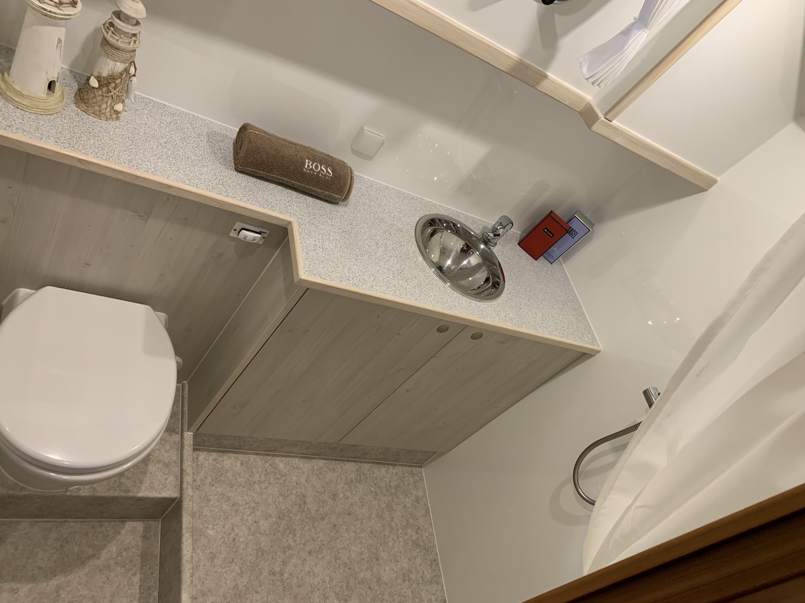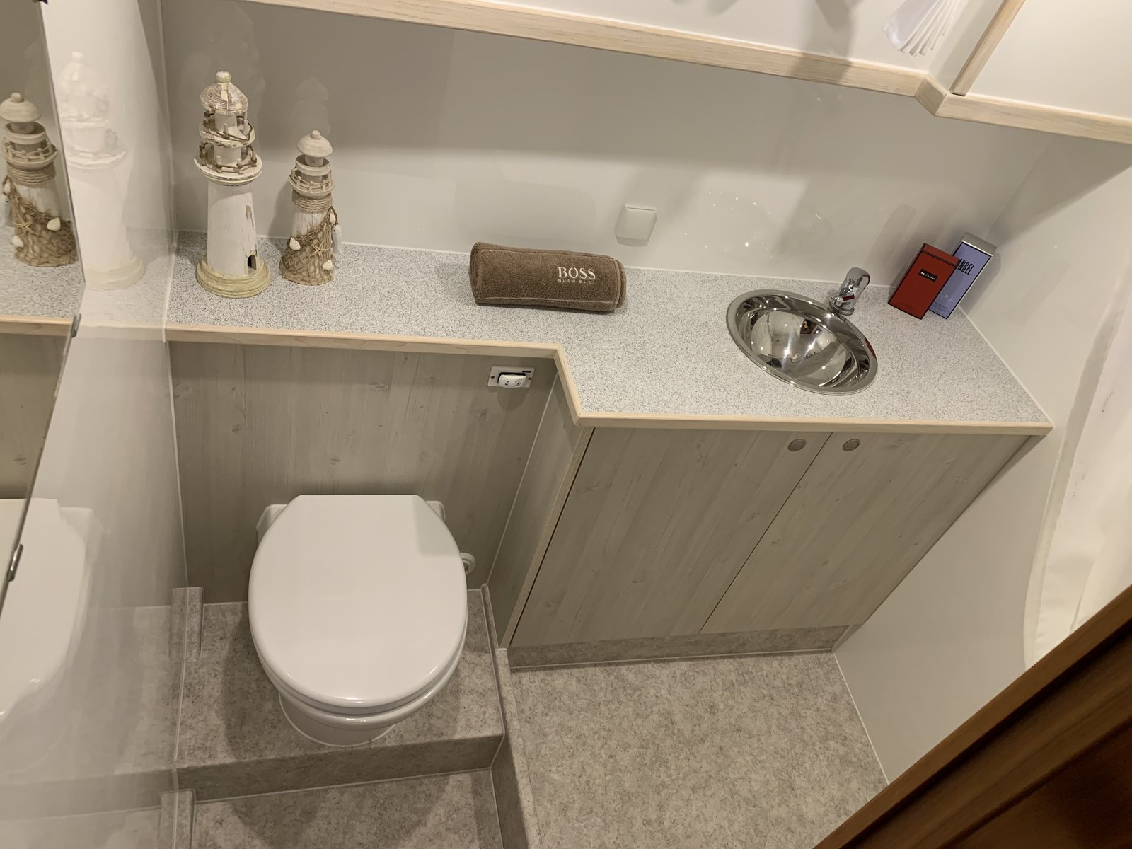 The interior is practically laid out and finished in cherry wood with teak-line flooring. The saloon features a U-shaped bench seat with Alcantara upholstery and a wall of cabinets opposite. The fully equipped galley is open to the saloon. Opposite the galley is a bathroom with a toilet, shower, and washbasin. Forward is a cabin with a V-shaped berth, which can be filled with a filler, and ample wardrobes. Aft is a separate shower/toilet room and a cabin with a semi-detached bed and various wardrobes.