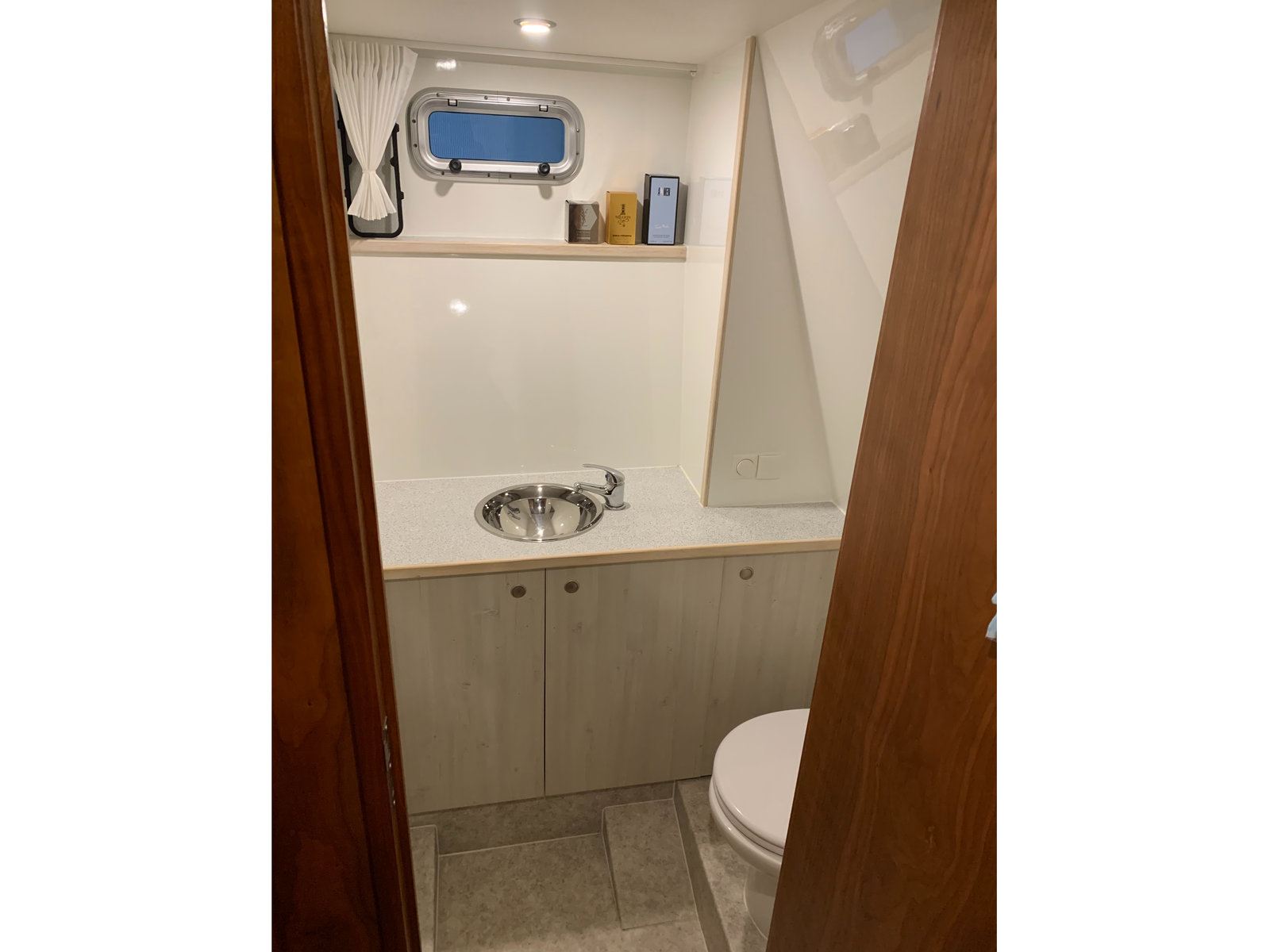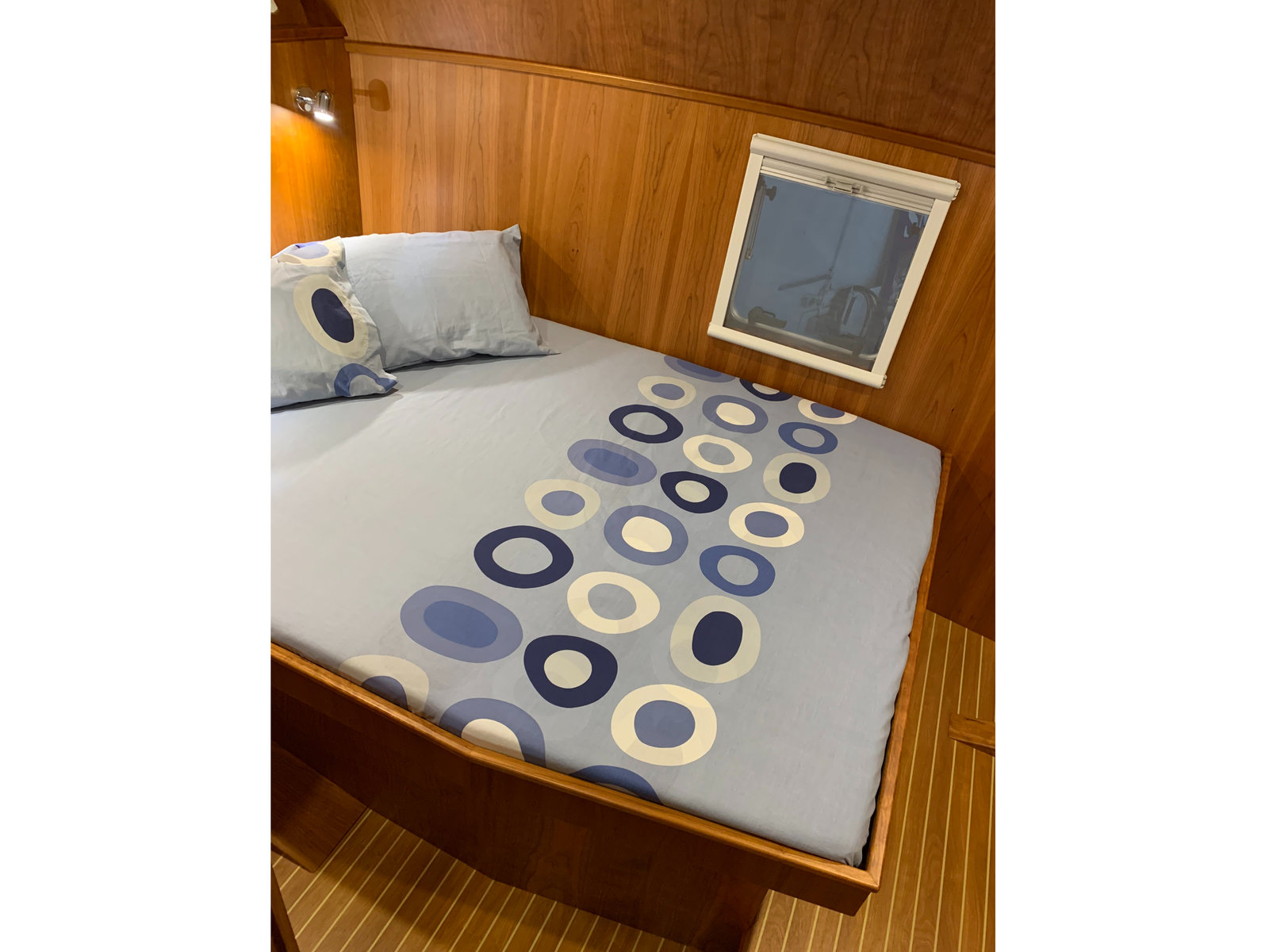 A practical aft cabin (family) cruiser, with two cabins, each with its own shower/toilet.