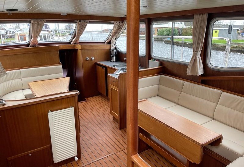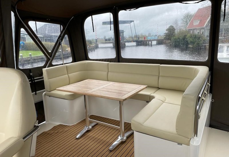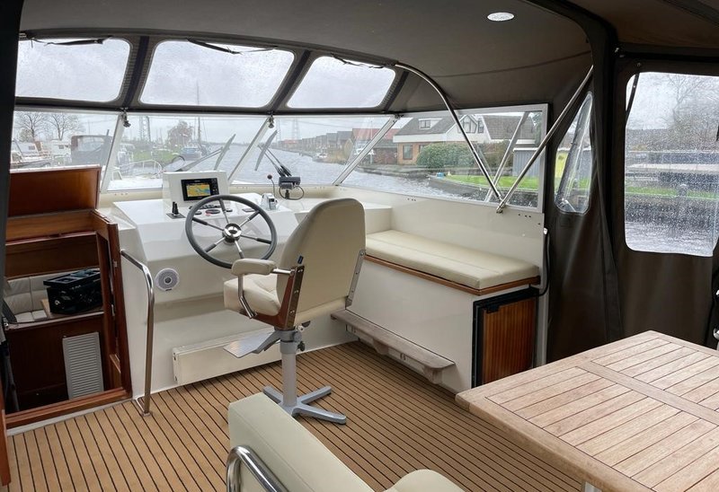 This motor yacht will be refitted in the winter of 2022/2023, including new upholstery and a navigation package. The yacht features an external steering system and a fully heated convertible aft deck. The aft deck features a spacious, comfortable U-shaped sofa with upholstered cushions and an additional refrigerator.