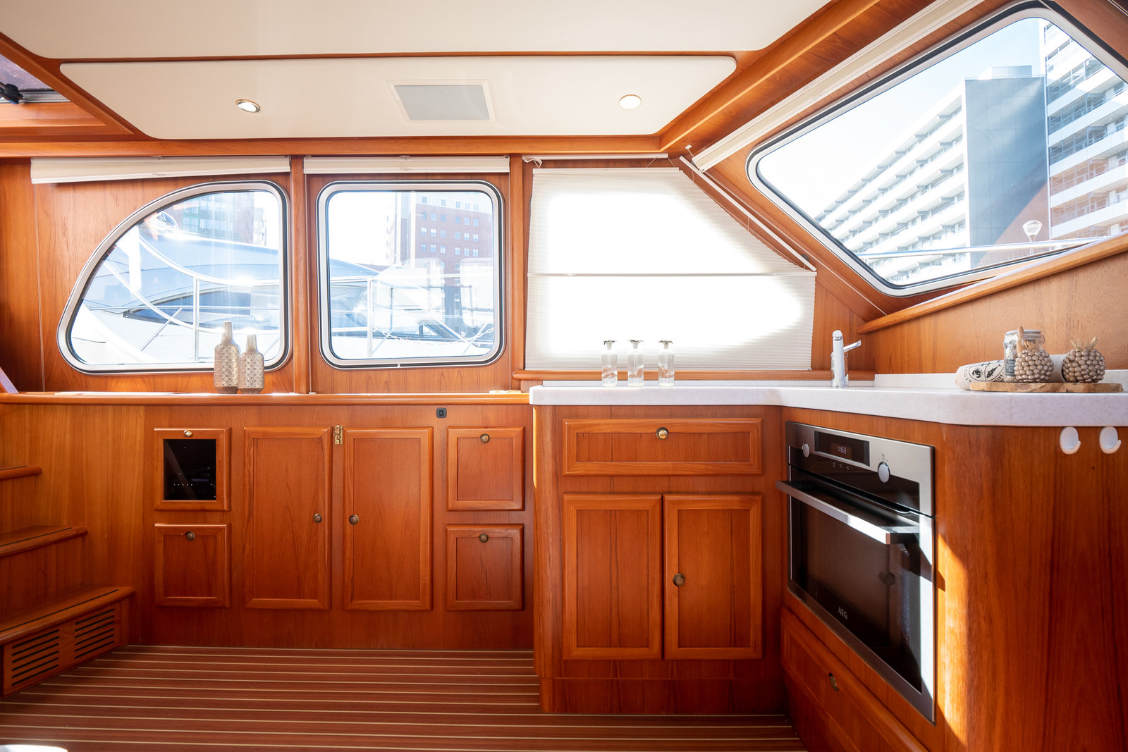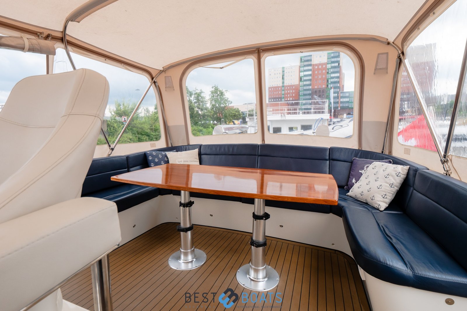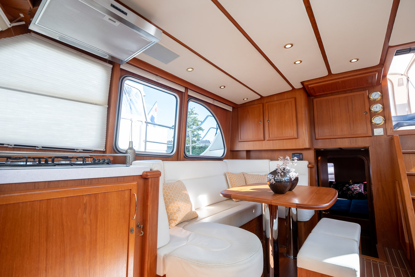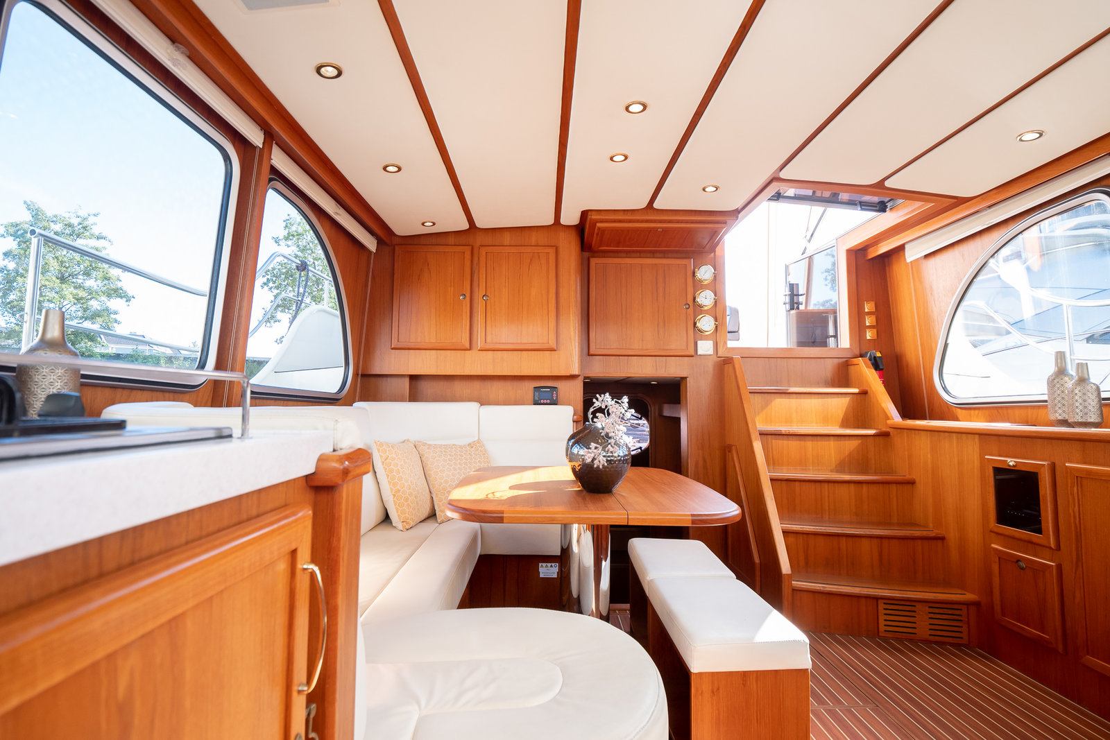 The ship is equipped with central heating, ensuring comfortable sailing at all times with this robust motorboat. So you can always take a shower with lovely hot water in one of the bathrooms on board. On the spacious Flexiteak aft deck with comfortable seating, you can enjoy the view from morning to night during your boating holiday. The heated XXL cover tent, along with the mosquito screens, ensures comfortable, sheltered, and warm seating on the aft deck all season long.