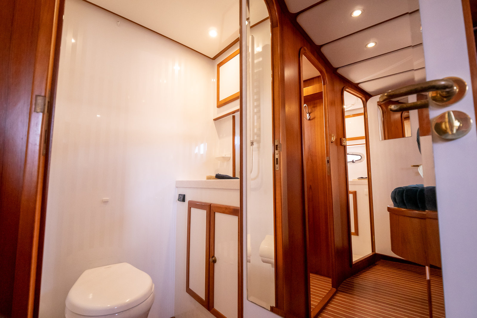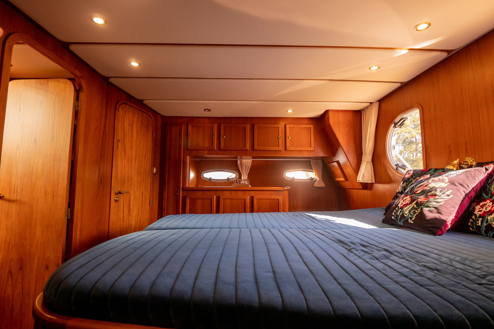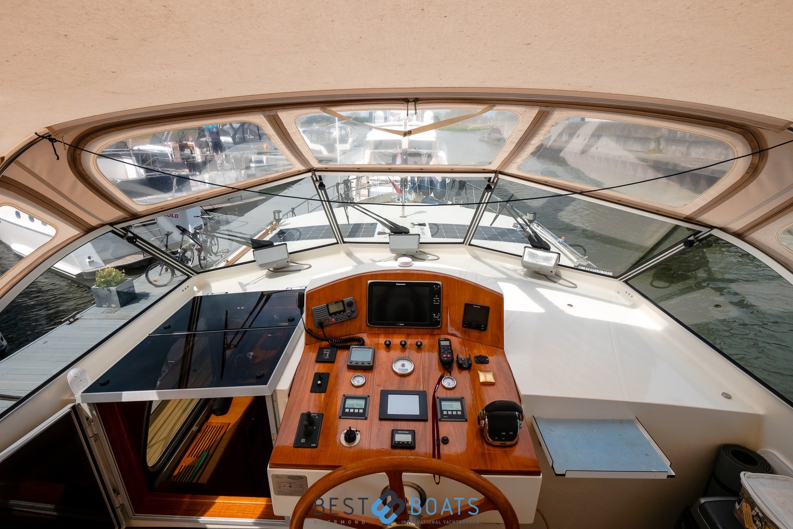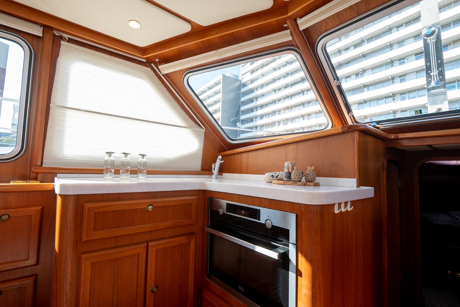 The ship is equipped with central heating, ensuring comfortable sailing at all times with this robust motorboat. So you can always take a shower with lovely hot water in one of the bathrooms on board. On the spacious Flexiteak aft deck with comfortable seating, you can enjoy the view from morning to night during your boating holiday. The heated XXL cover tent, along with the mosquito screens, ensures comfortable, sheltered, and warm seating on the aft deck all season long.