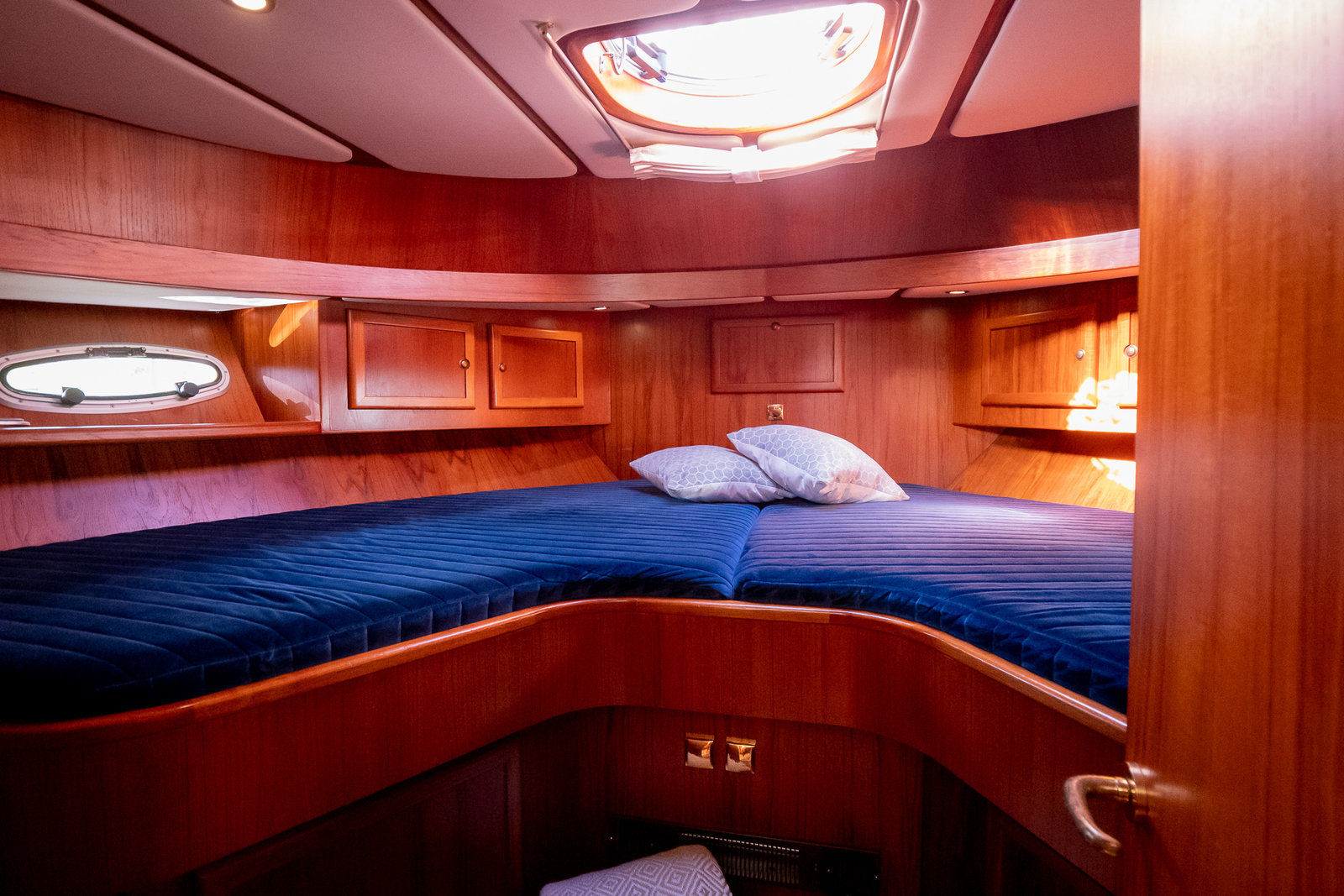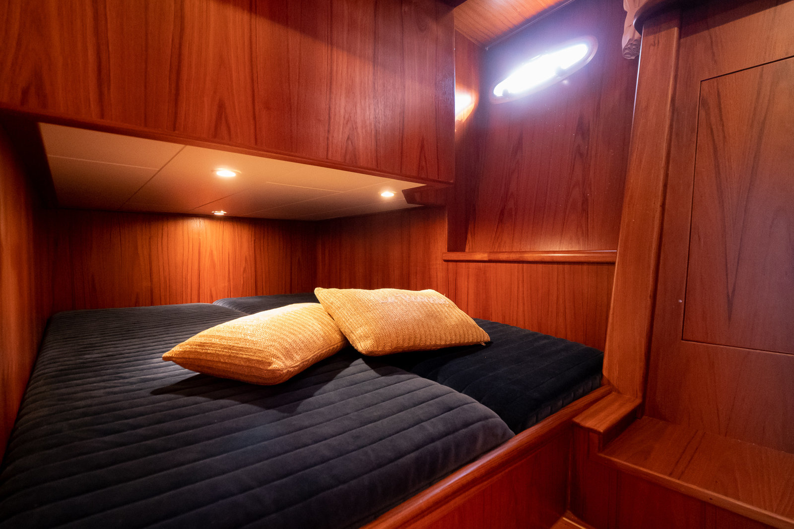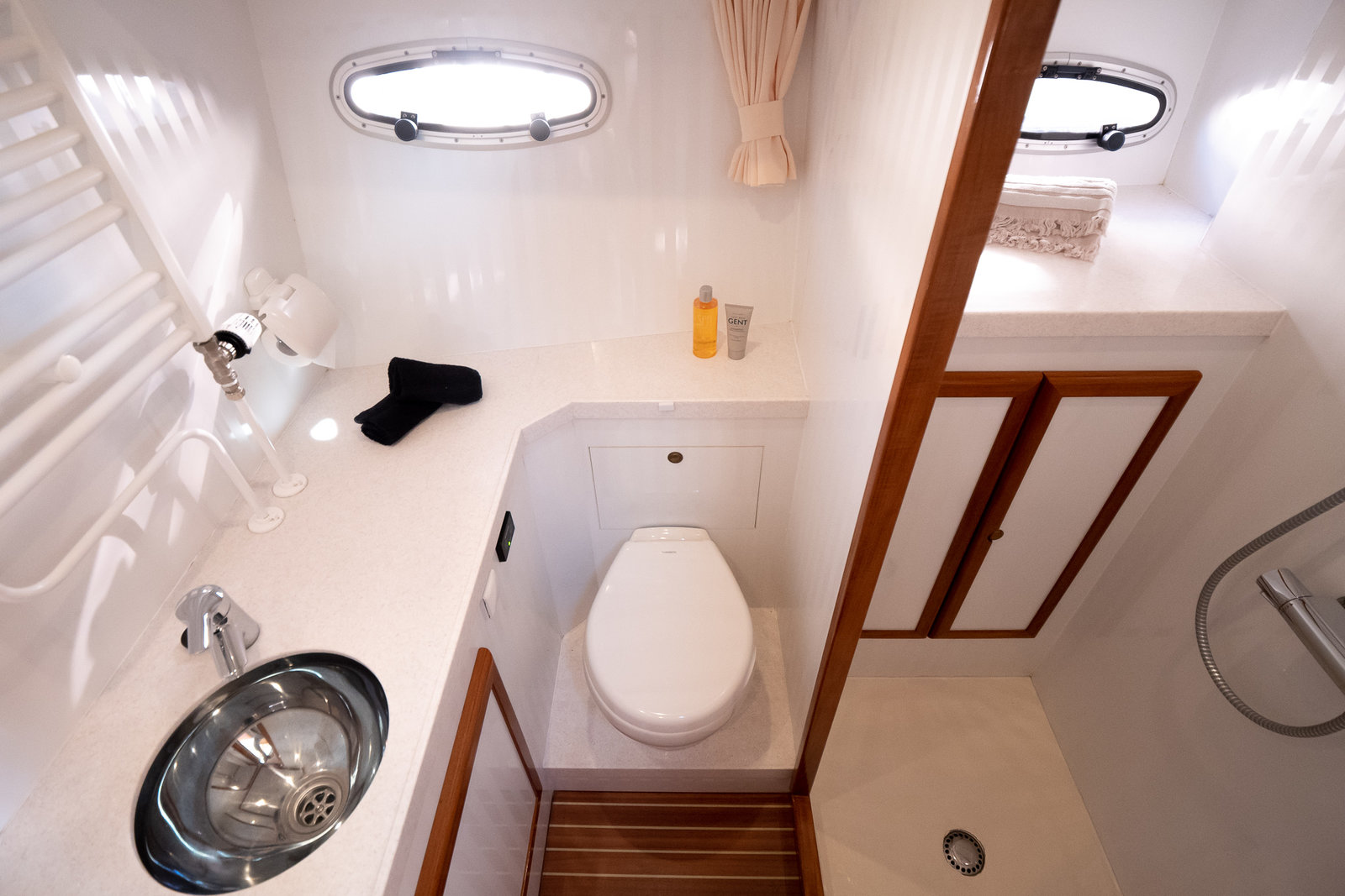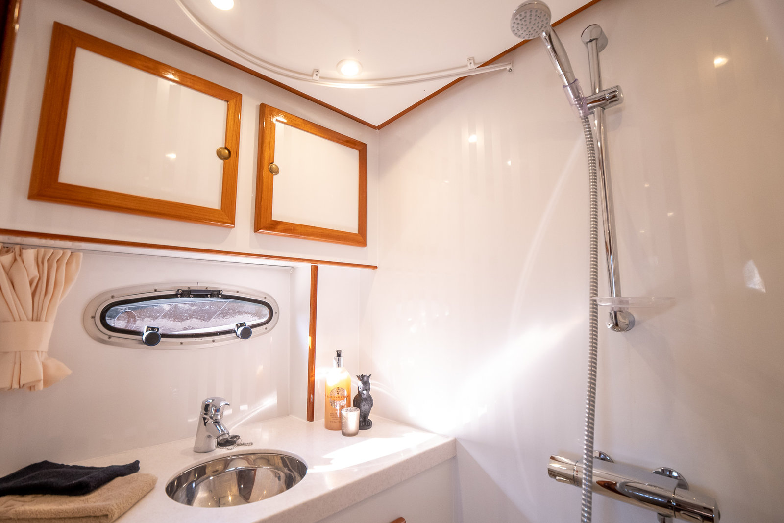 The ship is equipped with central heating, ensuring comfortable sailing at all times with this robust motorboat. So you can always take a shower with lovely hot water in one of the bathrooms on board. On the spacious Flexiteak aft deck with comfortable seating, you can enjoy the view from morning to night during your boating holiday. The heated XXL cover tent, along with the mosquito screens, ensures comfortable, sheltered, and warm seating on the aft deck all season long.