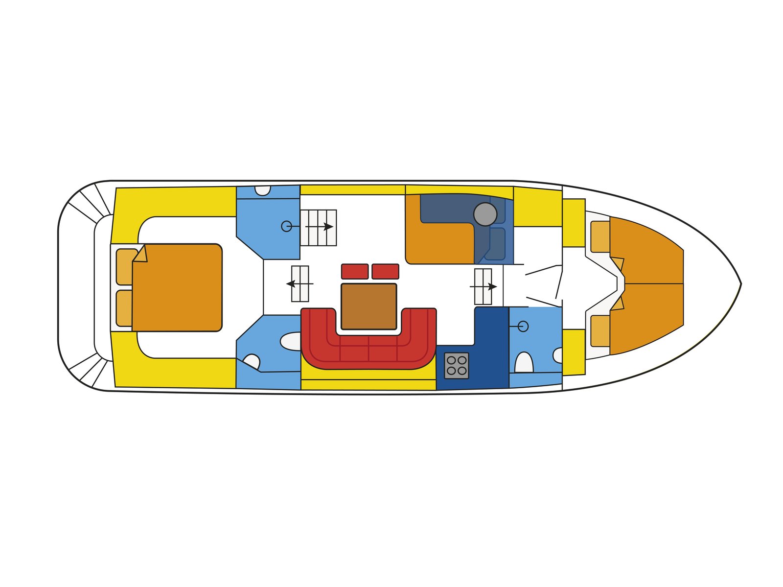 At 12.9 meters long, this Drait Deluxe motor yacht is suitable for groups of 2 to 7 people. This makes it the ideal partner for a boating holiday with your family, friends, or relatives. On board, you'll find 3 cabins with 6 fixed berths, equipped with multiple sanitary facilities, providing plenty of space and privacy. Sailing with children is perfectly possible with this Drait Deluxe 42. The Drait Deluxe 42 features a swim platform with two steps, offering both convenience and fun for all ages. Everyone can easily get in and out of the water.